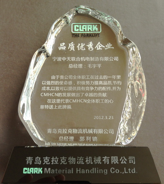 在本月召開的青島克拉克物流機械有限公司供應(yīng)商會議中,中天公司在30多家供應(yīng)商中憑借優(yōu)秀的質(zhì)量、成本及交貨率被評為品質(zhì)優(yōu)秀企業(yè)。此次會議共設(shè)兩名優(yōu)秀供應(yīng)商,中天公司為獲得此殊榮的兩家企業(yè)之一。
